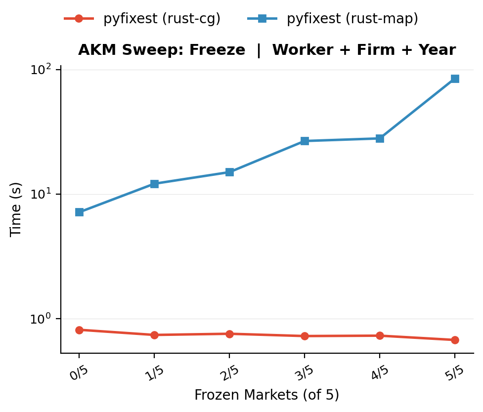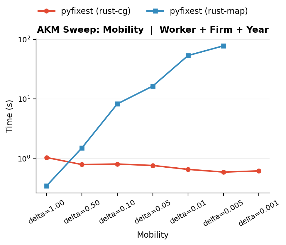 On this easy problem, the standard worker + firm + year specification is solved routinely well by both algorithms because each sweep already removes most of the variation. The rust-map backend will not look this good in any other of the benchmarks to follow, which all reduce the level of connectivity between workers and firms.