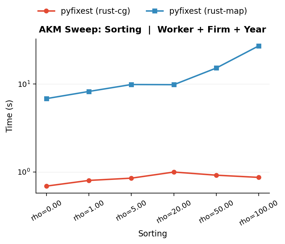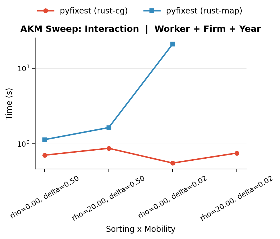The combination of \(\rho = 20\) and \(\delta = 0.02\) produces runtimes far exceeding what either factor alone would predict. Sorting thins out the bridges between quality bands by making movers switch only between similar firms, while low mobility means there are few movers to begin with. Together, they produce an extremely sparse graph where MAP has almost no cross-fixed-effect information to work with.