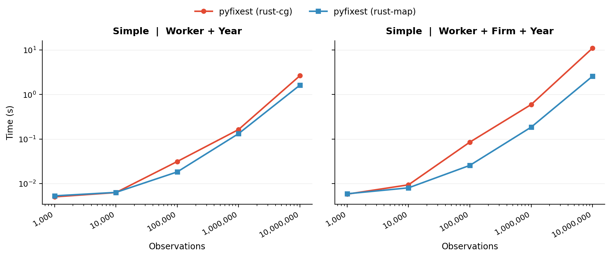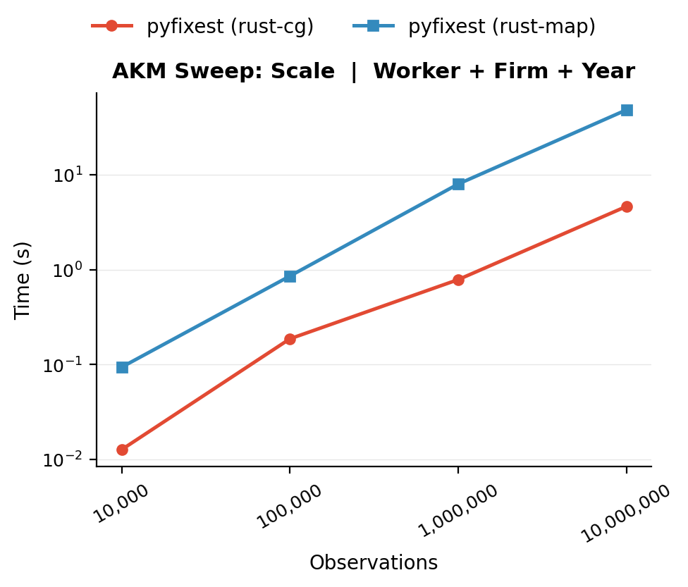 pyfixest (rust-map)implements MAP without acceleration,pyfixest (rust-cg)implements the CG-Schwarz strategy viawithin’s solver.