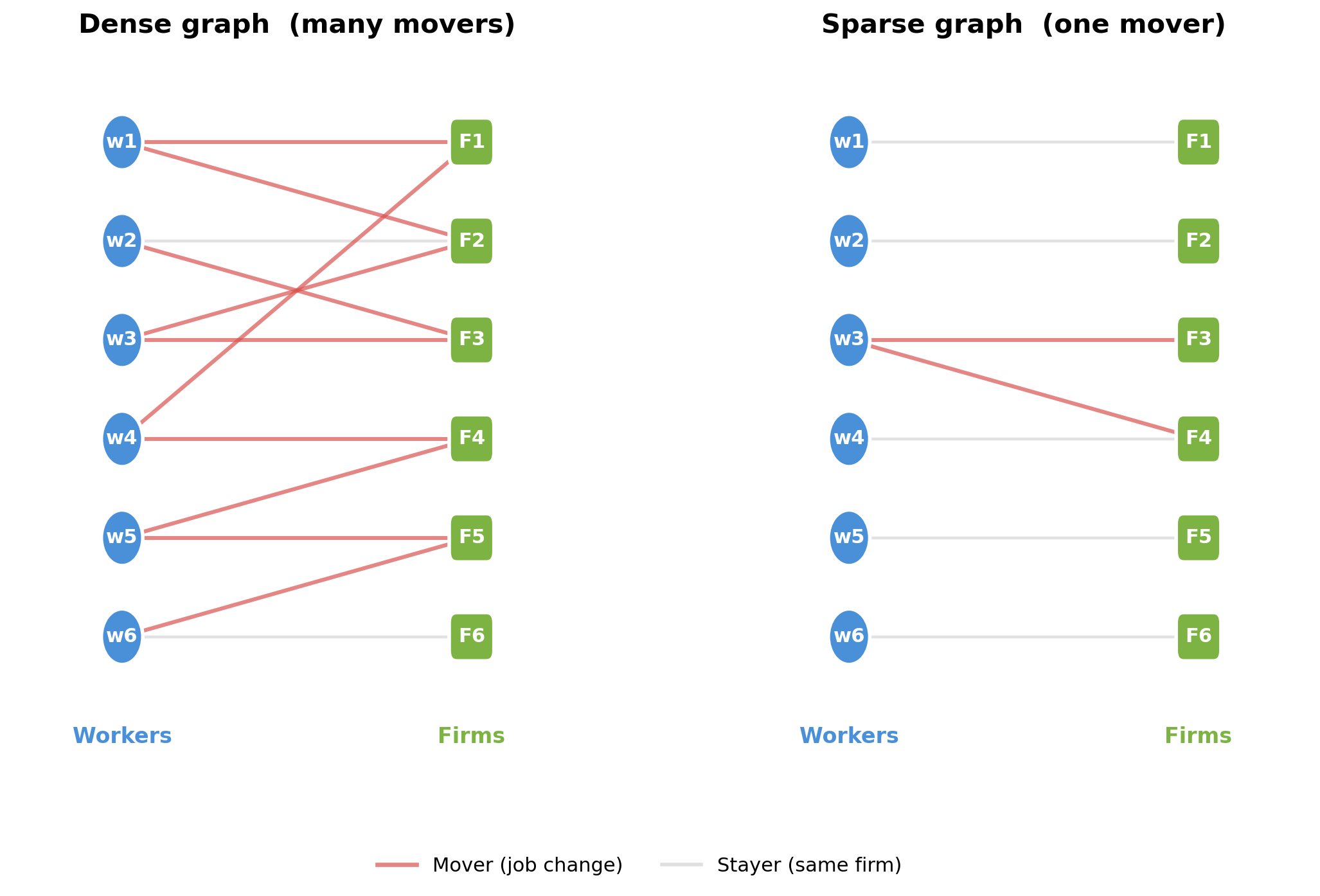 Workers and firms form a bipartite graph: workers are one set of nodes, firms are the other, and each employment spell is an edge. Movers - workers who change firms - are the workers whose edges connect different parts of the graph. Without movers, worker and firm effects are not separately identified.