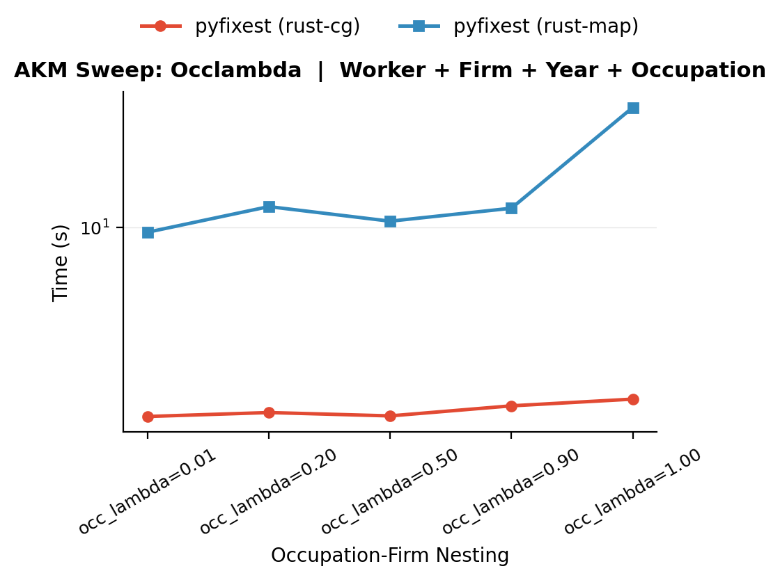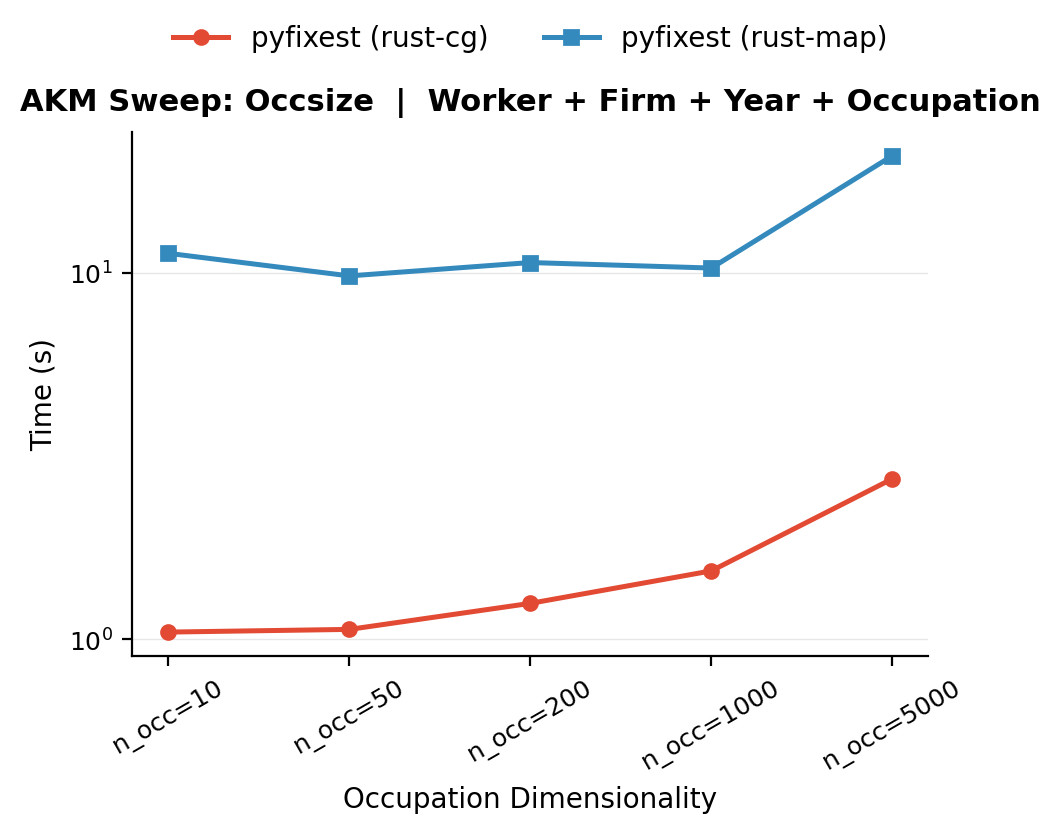 Increasing the number of occupation levels makes the problem harder as the occupation sub-graph thins out. With 10 occupations, each level is observed at many firms and held by many workers, so the occupation cross-tabulation blocks are dense and well-conditioned. With 5,000 occupations, each level appears in far fewer observations, and the cross-tabulation blocks become sparse. This is the same graph-thinning mechanism that makes low mobility hard, just in the occupation dimension. The bencmark varies n_occupations from 10 to 5,000 while holding all other parameters at their defaults.