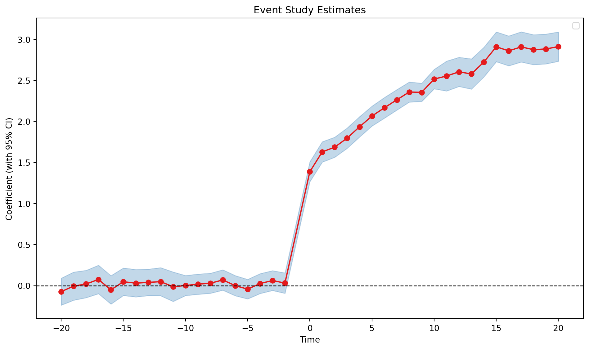 Event study plots like this are very informative, as they allow us to visually inspect the parallel trends assumption and also the dynamic effects of the treatment.
