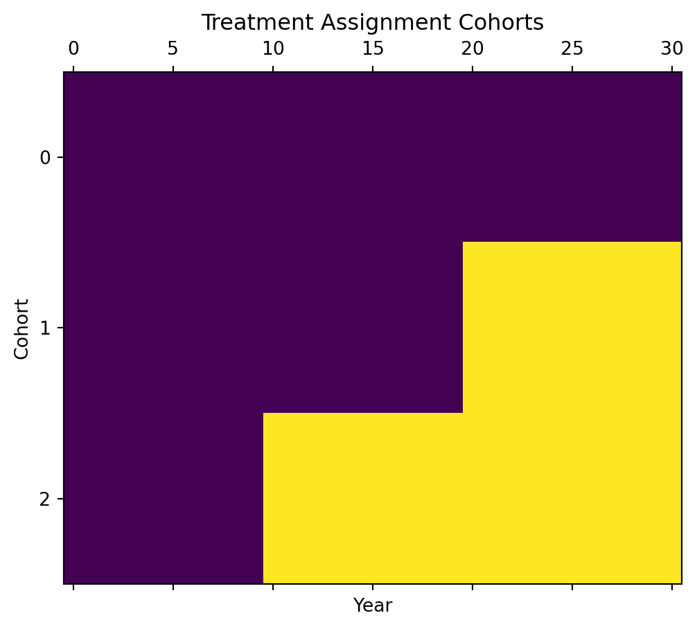 We now return to the data set with staggered treatment rollout, df_multi_cohort.