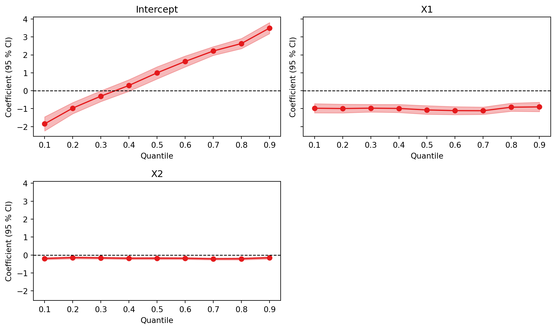 <Axes: title={'center': 'X1'}, xlabel='Quantile', ylabel='Coefficient (95 % CI)'>,